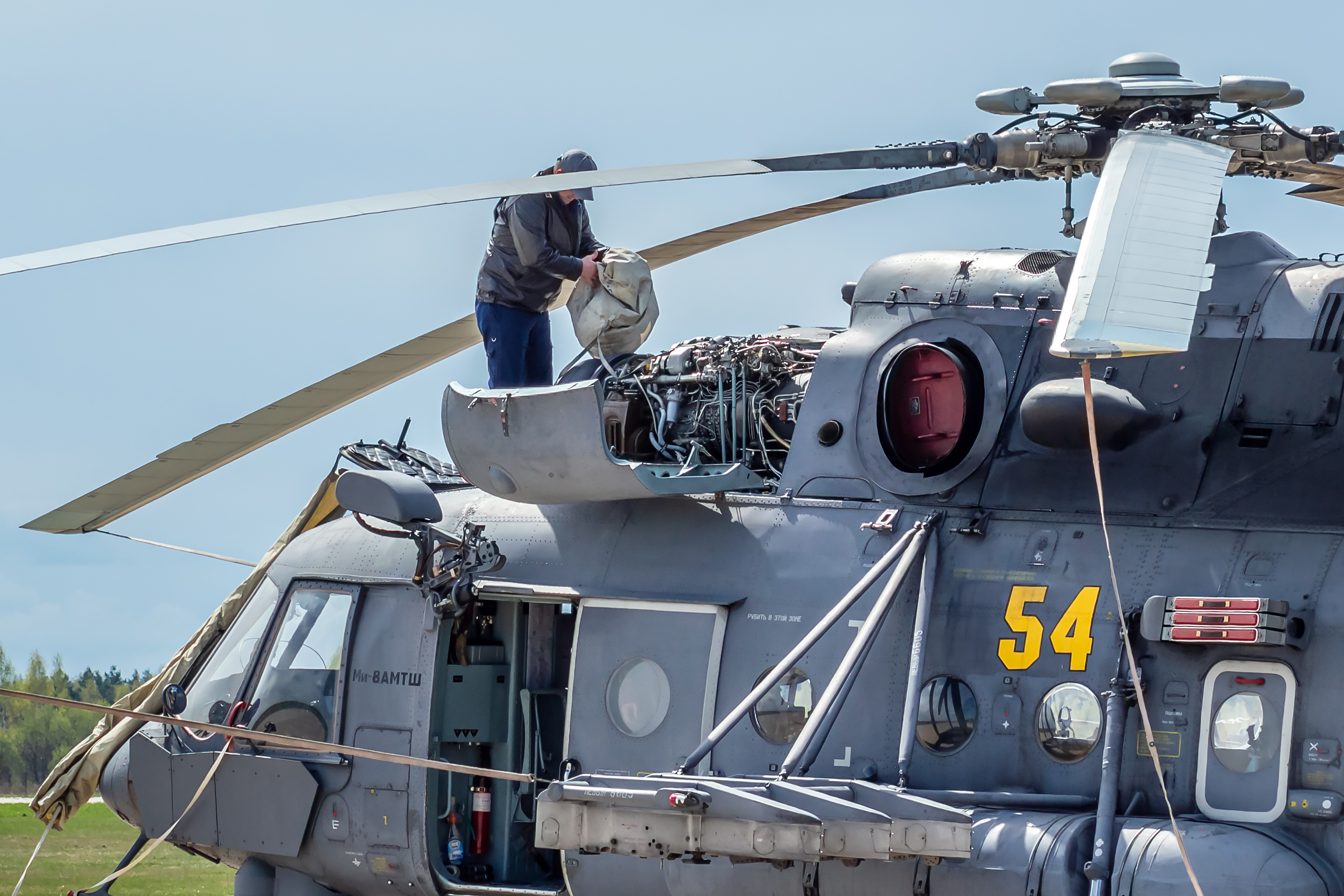 «Фотография была сделана в Кубинке 4 мая 2019 года после репетиции Парада Победы в Москве. Представленный на ней Ми-8АМТШ был в числе винтокрылых машин, которые открывали воздушную часть Парада над Красной площадью. После возвращения на аэродромы вертолеты сразу попадают в заботливые руки техников, которые проверяют все узлы и агрегаты. Видно, что они занимаются двигателями со знанием дела. На фото техник проводит тщательный осмотр двигателя перед тем, как зачехлить машину», – рассказала Ирина Теущакова.