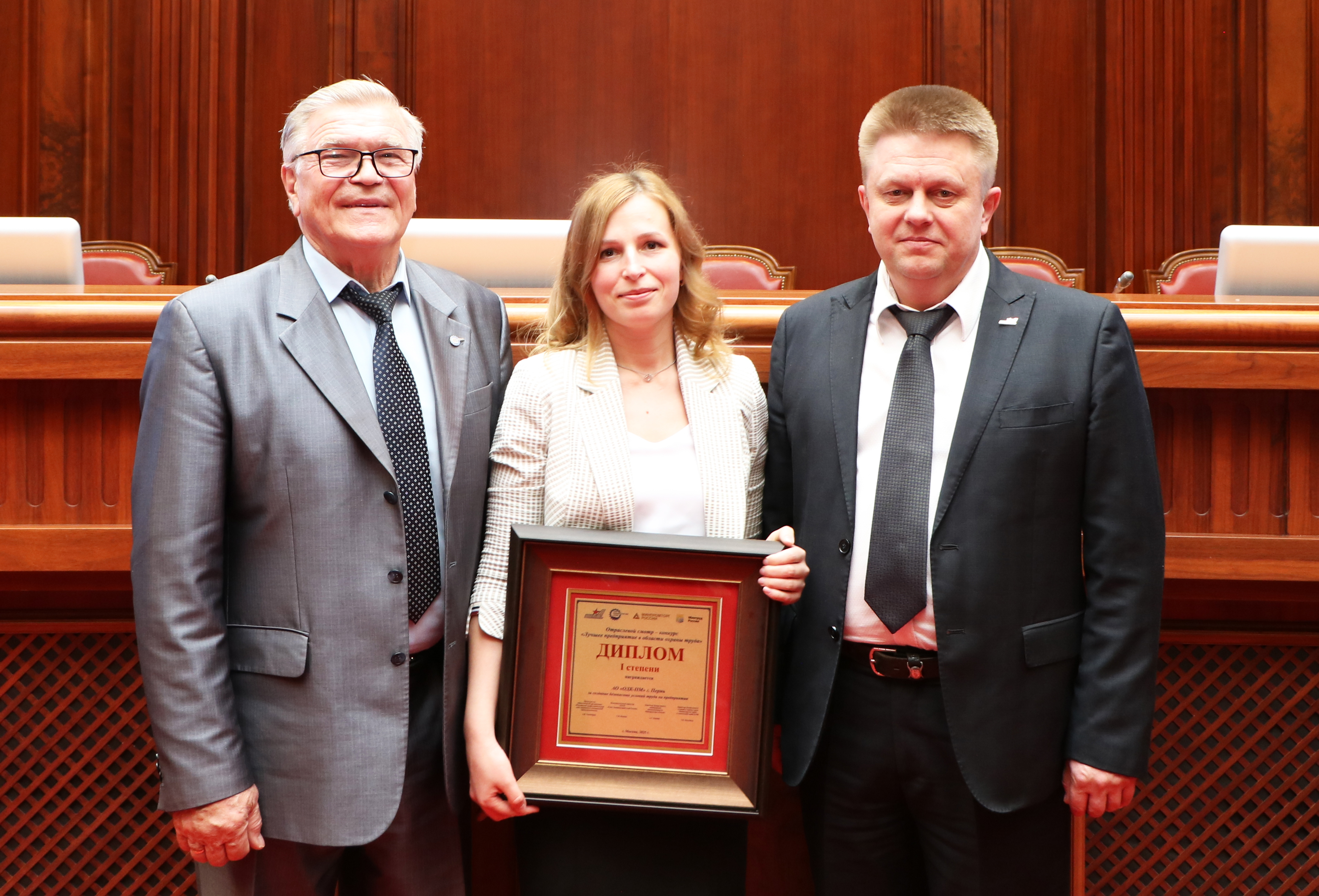 НА СНИМКЕ: начальник отдела охраны труда АО «ОДК-Пермсккие моторы» Татьяна Толстикова с Дипломом I степени. Справа – председатель Общественной организации «Российский профессиональный союз трудящихся авиационной промышленности» Алексей Тихомиров, слева – исполнительный директор общероссийского отраслевого объединения работодателей «Союз машиностроителей России» Сергей Иванов.