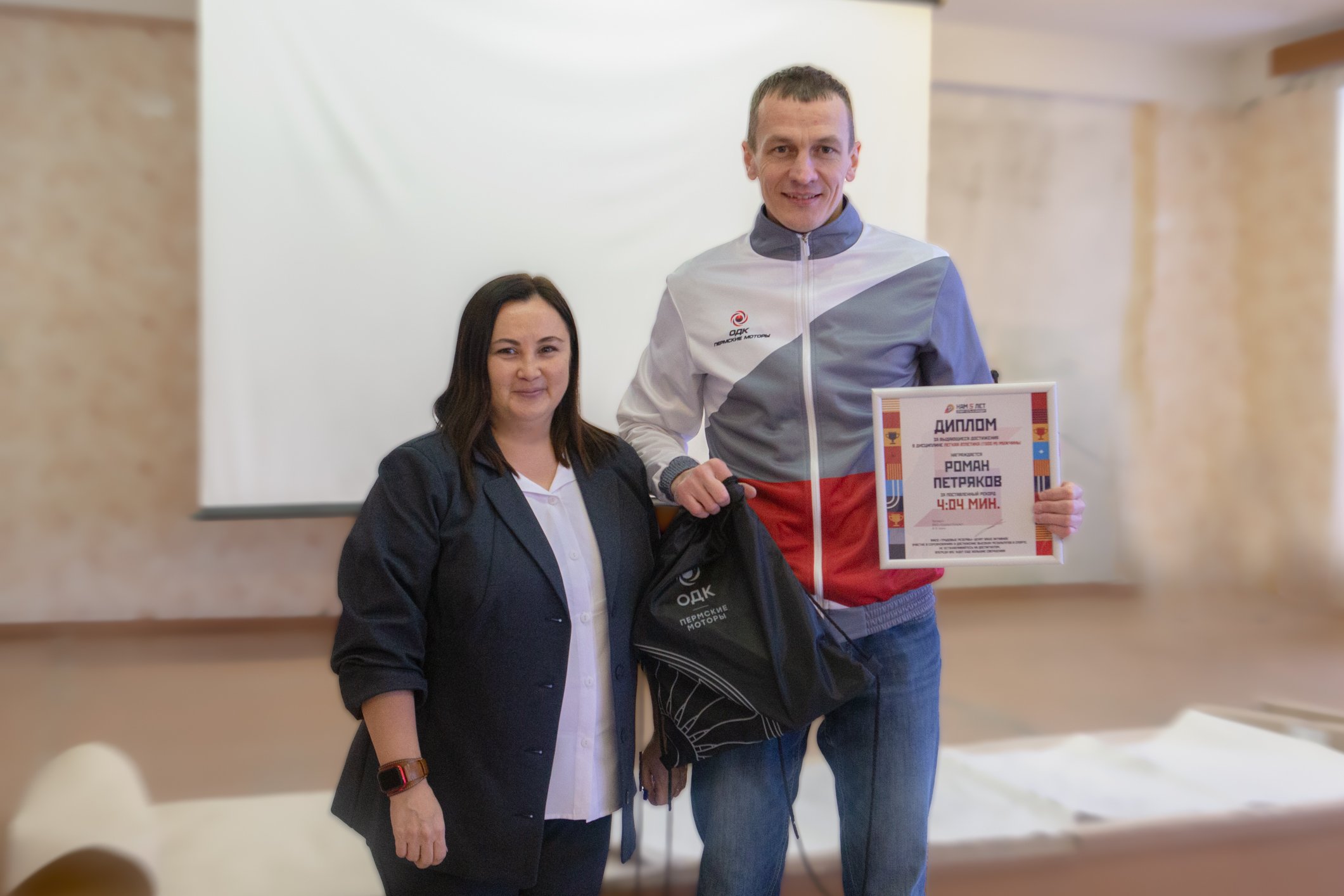 Диплом ВФСО «Трудовые резервы» за выдающиеся достижения в легкой атлетике Роману Петрякову вручила начальник отдела корпоративной культуры и молодежной политики «ОДК-Пермские моторы» Стелла Эмир-Вели.