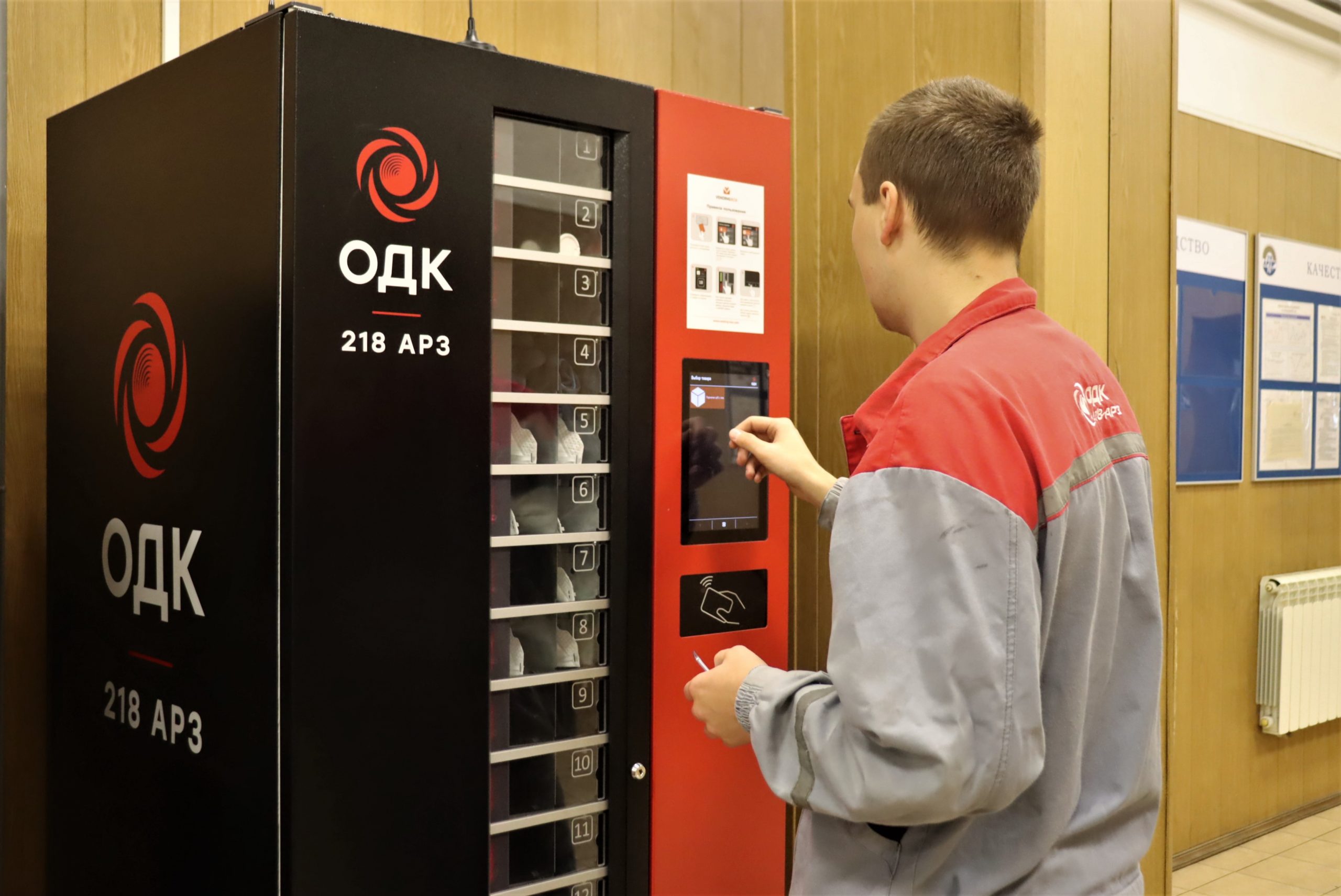 Теперь сотрудники могут получить маски, перчатки, защитные кремы и другие расходные материалы, приложив пропуск к вендинговому аппарату. После идентификации работника автомат выдает положенные средства индивидуальной защиты по правилам и нормам, существующим на заводе.