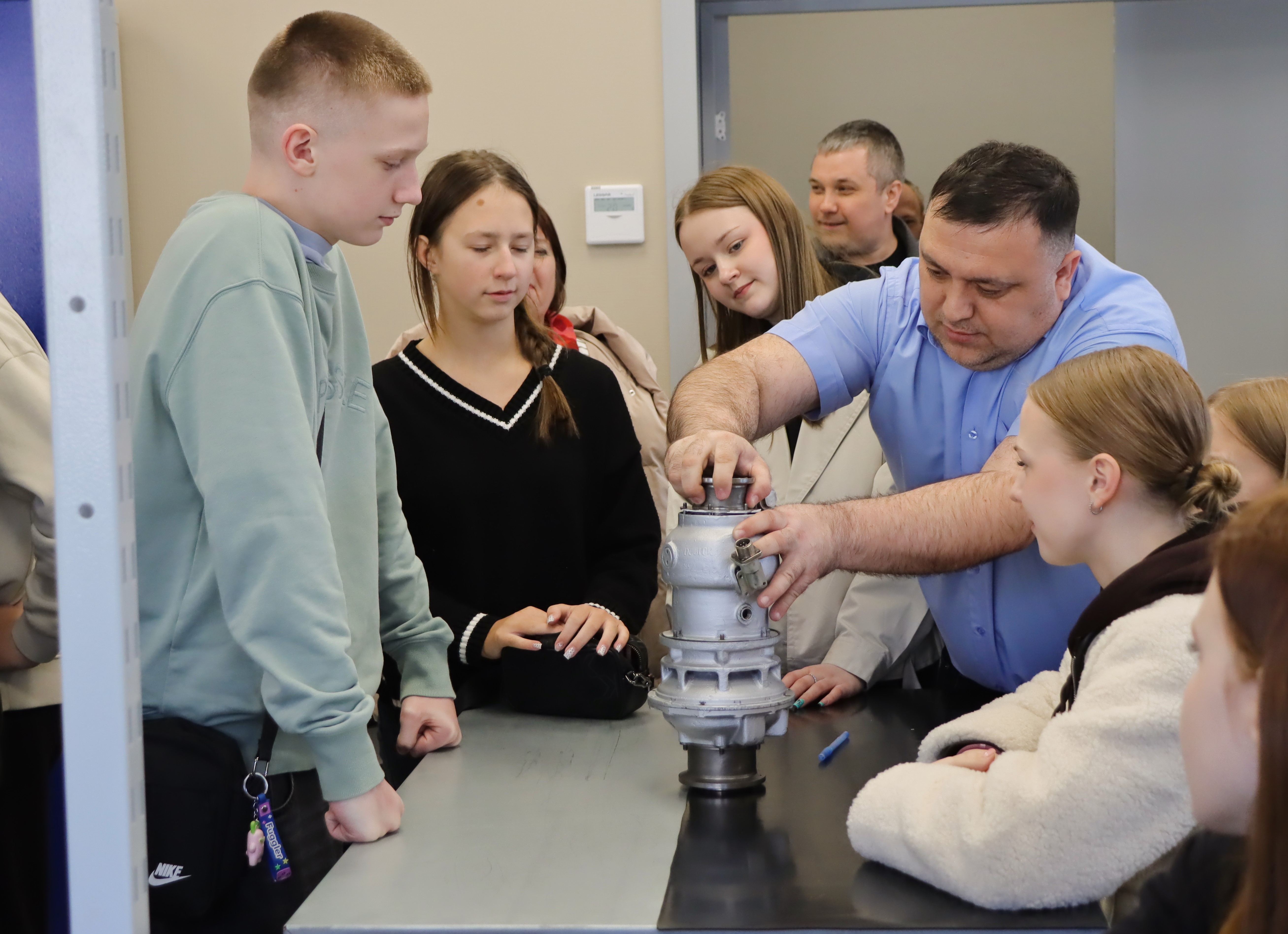 Мастер производственного обучения Фируз Саидов и начальник учебно-производственного отдела Иван Овчинников организовали для школьников практическое занятие: участники самостоятельно провели стыковку корпусов воздушного стартера с постановкой крепежных деталей. Также ребята научились проводить измерение штангенциркулем.