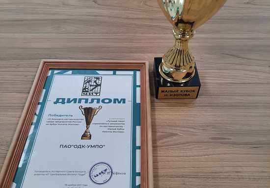 Объединение победило в номинации «Лучший пакет нормативных документов по наставничеству» и удостоено малого Кубка Изотова. В числе документов, представленных на конкурс, – положения о наставничестве и программы Производственно-учебного центра авиационного комплекса Ростеха: «Обучение наставников», «Обучение инструкторов-наставников», «Основы деятельности мастера производственного обучения».