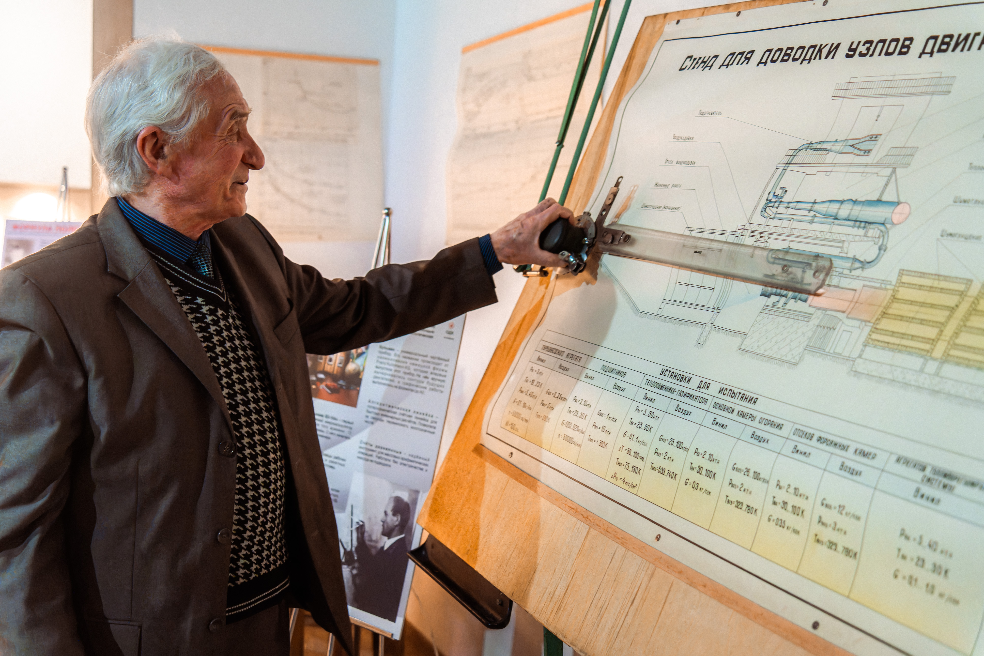 Центральное место в экспозиции занимает подлинная реконструкция рабочего места инженера золотой эпохи советского двигателестроения. Вниманию посетителей представлены легендарные орудия труда тех лет: массивный кульман, за которым рождались чертежи будущих двигателей, строгий стол, логарифмическая линейка, чертежи, кальки, штампы.